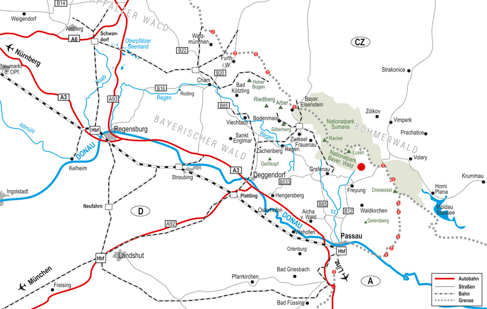 München auf der Autobahn A92 Richtung Deggendorf, dann ab Deggendorfer Kreuz die Autobahn A3 in Richtung Passau.